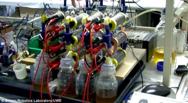 | Những bình nước tiểu mà các nhà khoa học của Phòng thí nghiệm Bristol Robotics sử dụng để sản xuất điện. Ảnh: UWE |