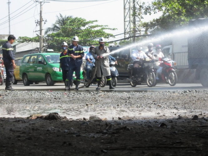 Nhận tin báo, công an phường nhanh chóng có mặt, phong tỏa hiện trường để đảm bảo an toàn cho người đi đường. Một xe cứu hoả của phòng cháy chữa quận 9 cũng được điều động dung nước để rửa hóa chất ra khỏi mặt đường.