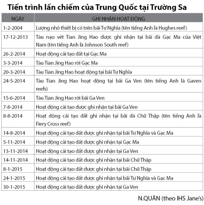 | Hình ảnh chụp từ vệ tinh của Công ty vũ trụ châu Âu Airbus Denfense & Space (trước đây có tên là EADS, đổi tên từ đầu năm 2014) vào các thời điểm khác nhau từ tháng 3/2014 đến tháng 1/2015 trên bãi Ga Ven thuộc quần đảo Trường Sa của Việt Nam cho thấy sự lấn chiếm xây đảo nhanh chóng của Trung Quốc. |