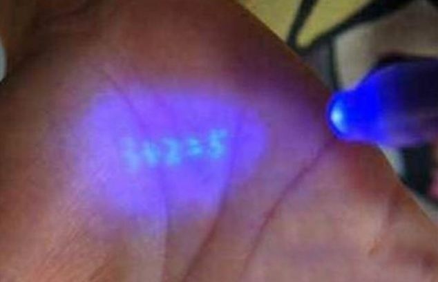 | Nhiều học sinh viết kiến thức ra tay bằng bút cực tím. Sau đó, khi vào phòng thi, chúng dùng một đèn siêu nhỏ để soi lên tay khiến các chữ hiện ra. |