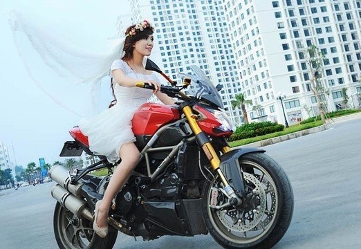 | Tuy khoác trên mình bộ váy cưới, nhưng Mai Thỏ vẫn thể hiện được sự mạnh mẽ khi ngồi trên chiếc xe phân khối lớn. (Ảnh: Viet Nguyen). |