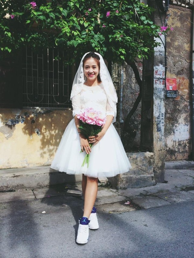 | 9X diện trang phục này khi hóa thân vai cô dâu trong một MV nhạc cùng thành viên Issac của nhóm 365. (Ảnh: NVCC). |