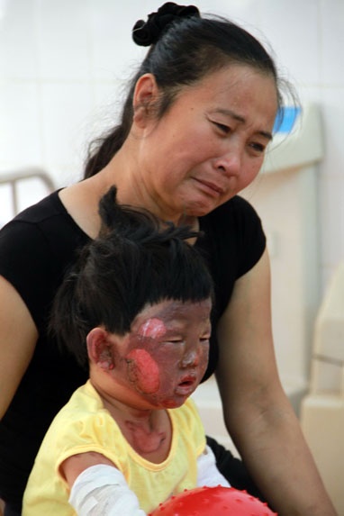 | Cháu Phạm Nhật Ninh (4 tuổi), con thứ hai của vợ chồng ông Tiệp, bị phỏng mặt và một phần cơ thể. |