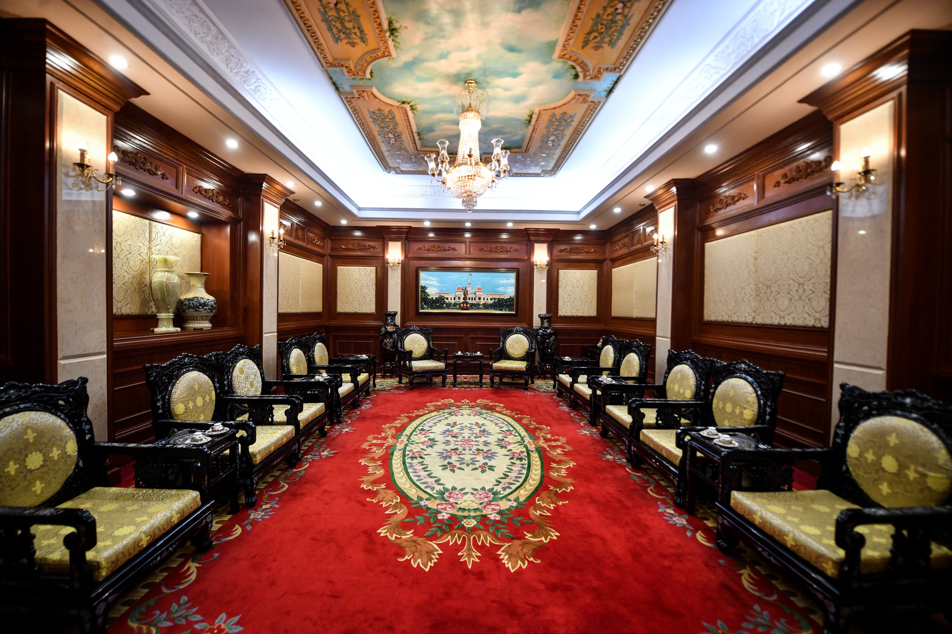 | Khách tham quan đứng quan sát và chụp ảnh phòng tiếp khách số 1 bên trong UBND TP.HCM. |