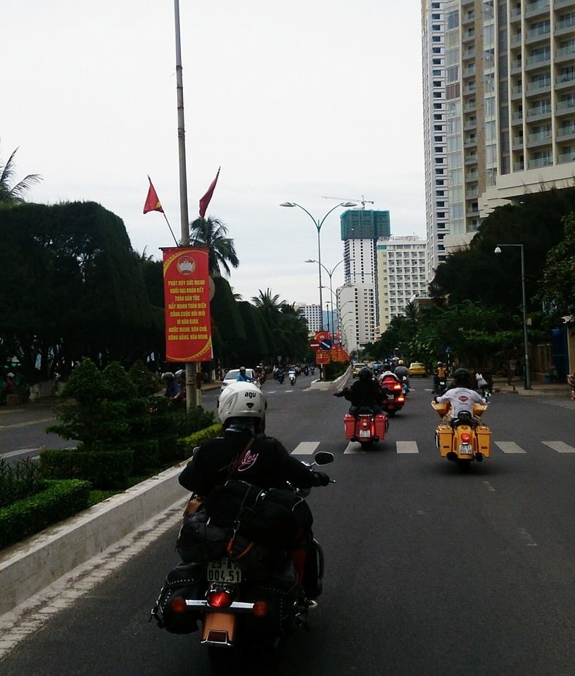 | Anh Đông, chủ nhiệm CLB môtô Nha Trang, Khánh Hòa đón tiếp và hướng dẫn. Cả đoàn đang chạy trên đại lộ Trần Phú, TP.Nha Trang. |