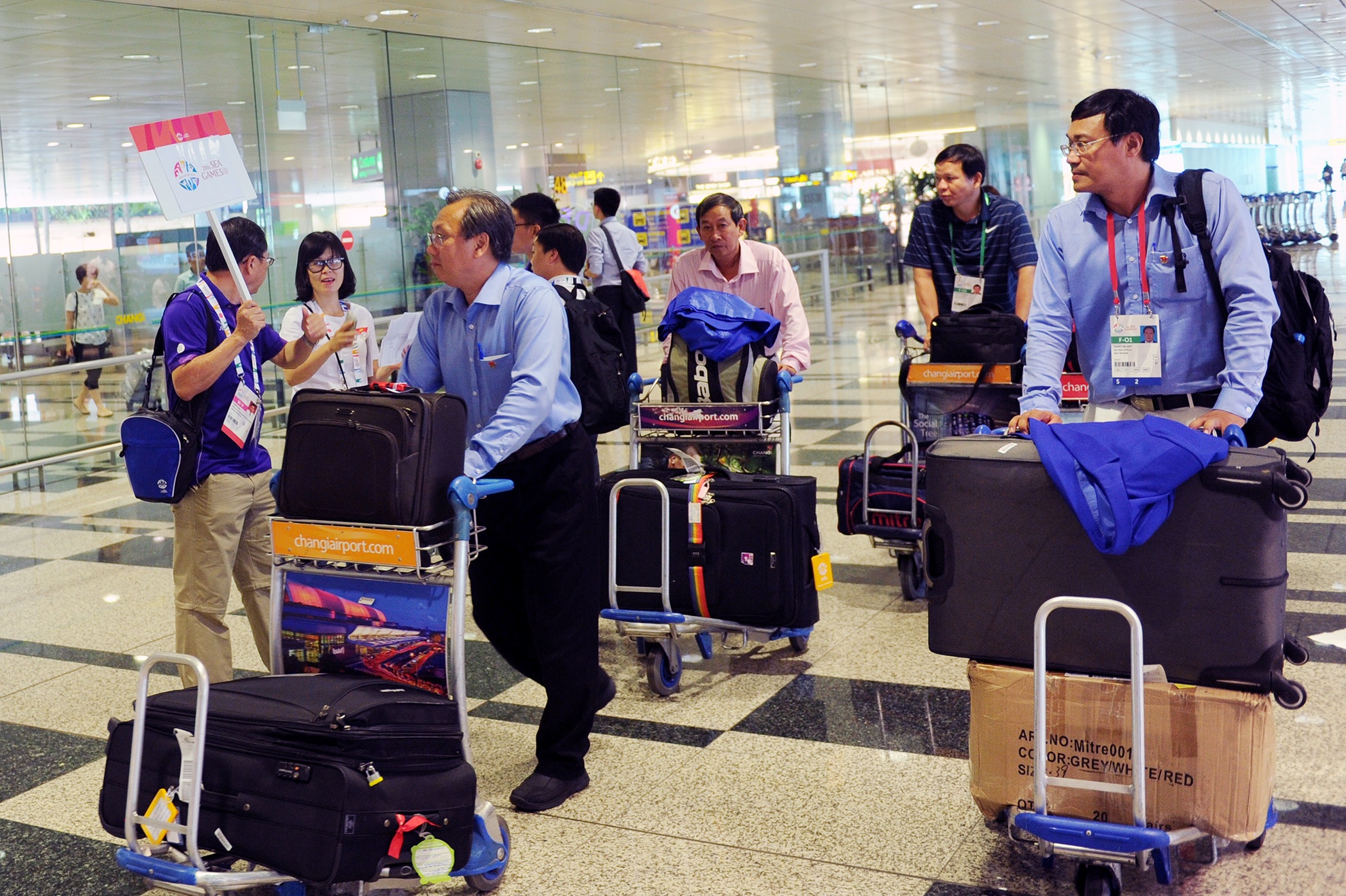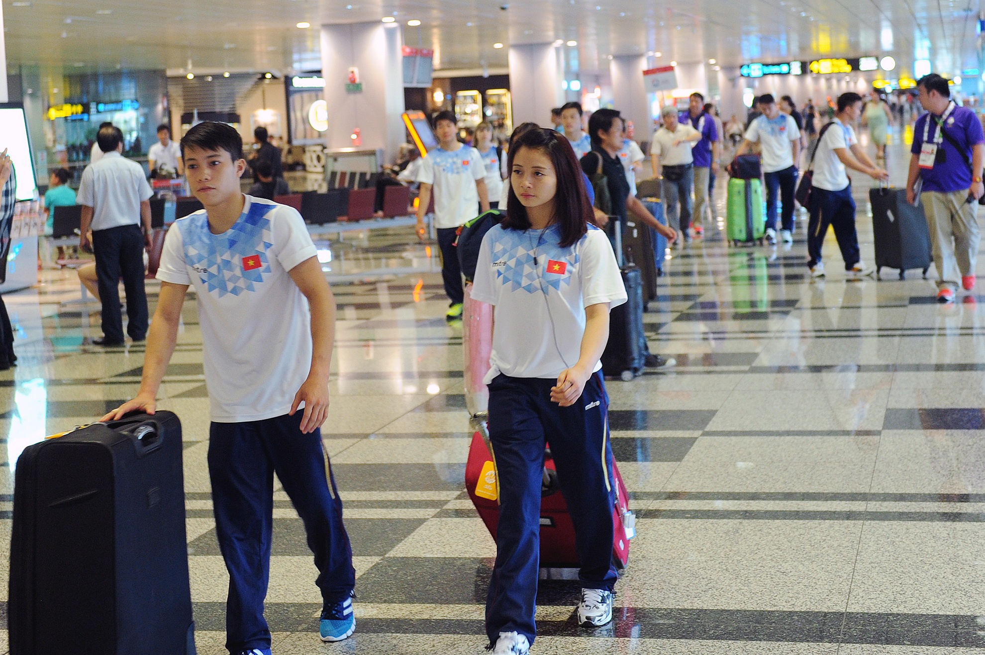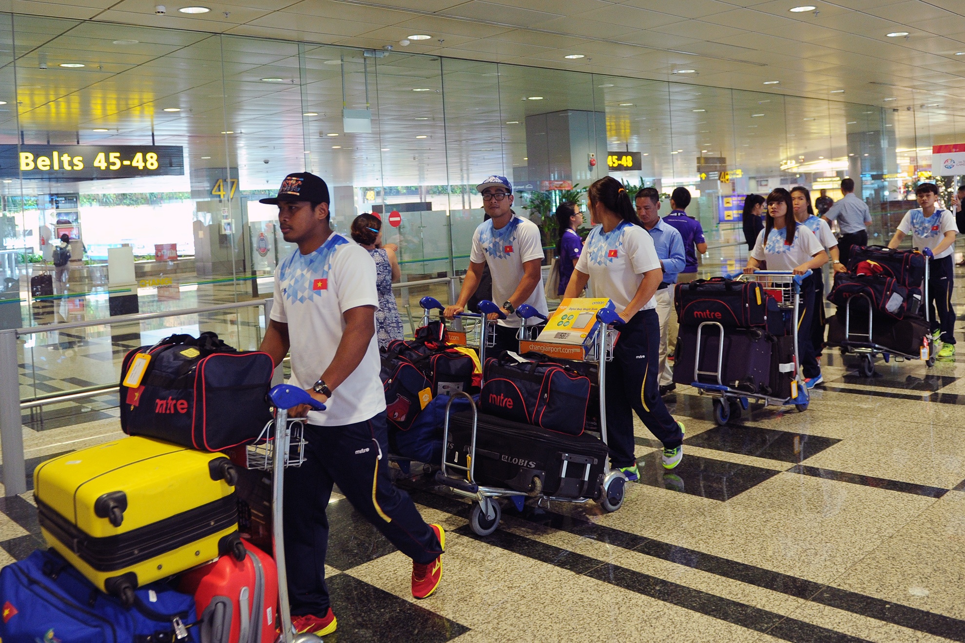 | Ngay sau đó, đoàn VĐV Việt Nam làm thủ tục xuất cảnh và ra máy bay. Đoàn được Vietnam Airlines tài trợ vận chuyển miễn phí toàn bộ trang thiết bị, dụng cụ thi đấu từ Hà Nội và TP HCM đến Singapore. |