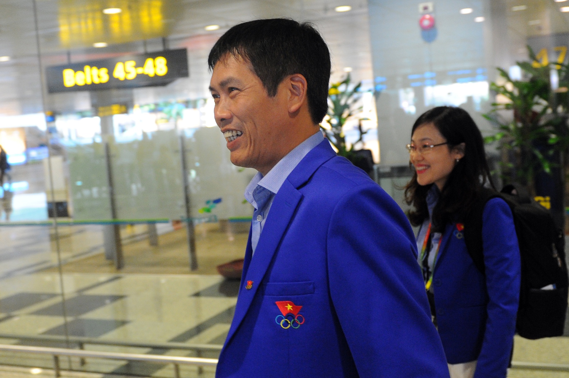 | Đi cùng đoàn có ông Vương Bích Thắng, Tổng cục trưởng Tổng cục TDTT (giữa) và ông Hoàng Vĩnh Giang, Phó chủ tịch Uỷ ban Olympic Việt Nam. Đoàn gấp rút về khách sạn và hội quân tại khu liên hợp Sports Hub để chuẩn bị cho lễ thượng cờ các nước vào 17h chiều nay. |