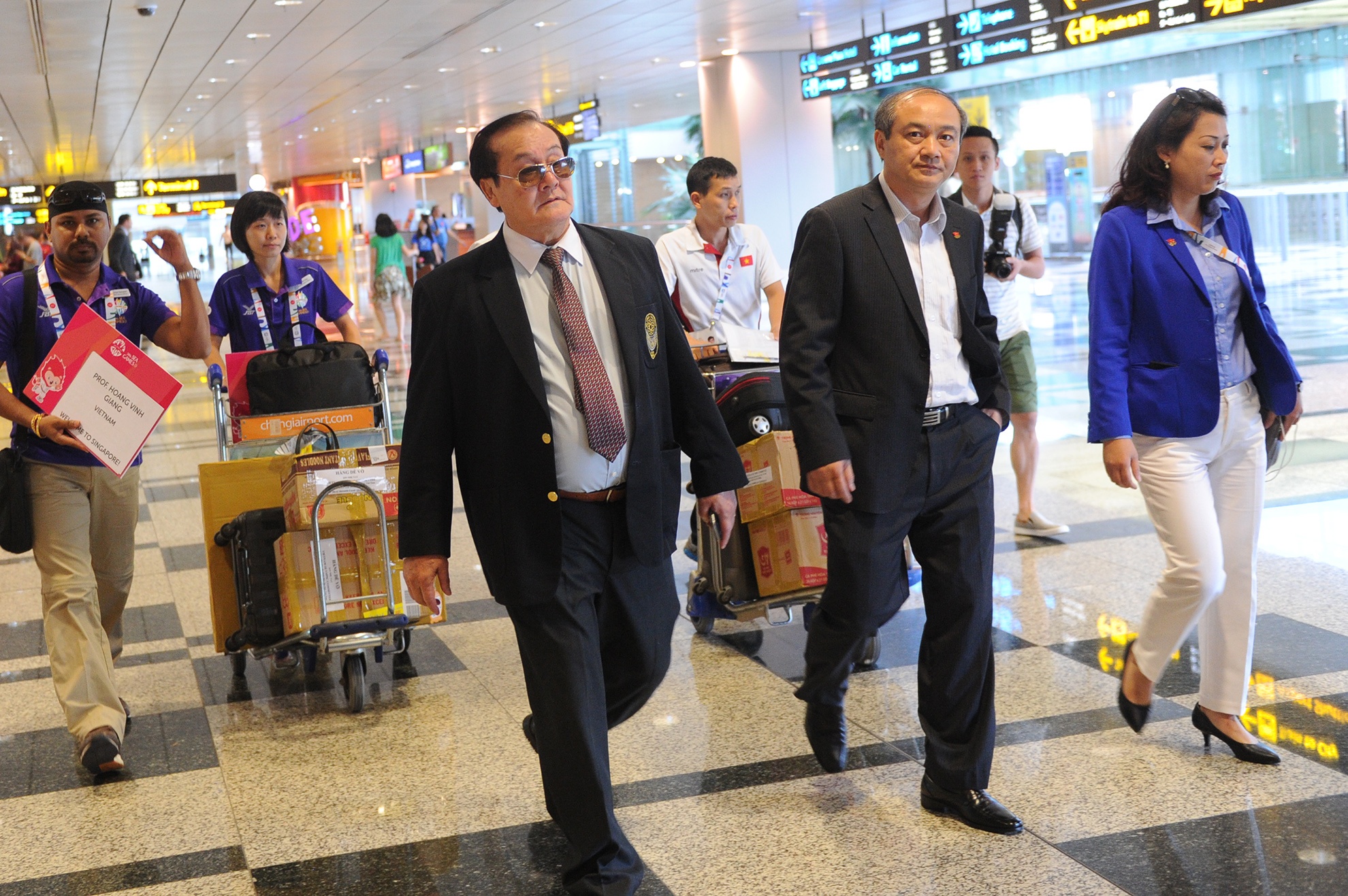 | Trưởng đoàn TTVN tại SEA Games, ông Trần Đức Phấn cũng có mặt tại sân bay Changi. Tinh thần của toàn đoàn rất hưng phấn, sẵn sàng cho những cuộc thi đấu trước mắt. Mục tiêu của Đoàn TTVN là giành từ 54-65 HCV, đứng trong tốp đầu. |