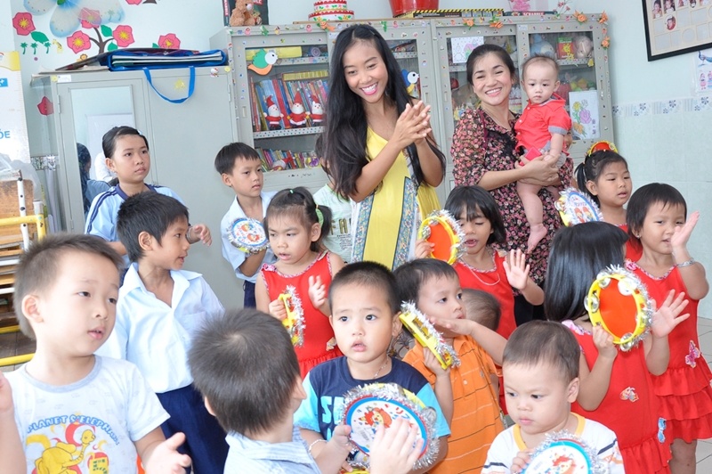 | Đoan Trang nhiệt tình vui chơi và ca hát cùng các em nhỏ. |