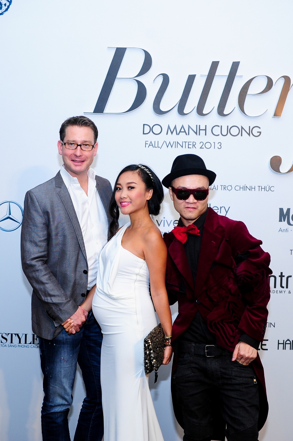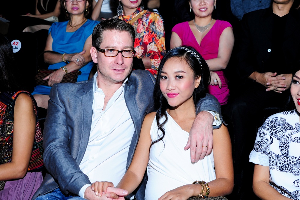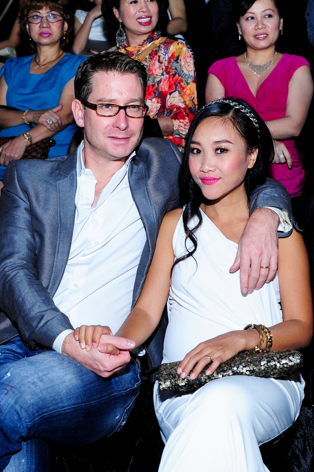 ''Thỏi Socola'' của làng giải trí không ngại mặc bộ váy dạ hội một bên vai ôm sát khoe bụng bầu 6 tháng tuổi. Cô tràn ngập hạnh phúc khi cùng chồng dự show diễn ''Những cánh bướm cuối thu''.