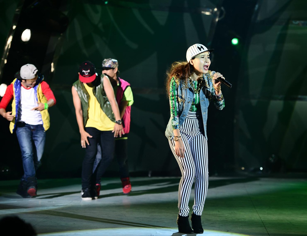 | Tuy nhiên vì mang bầu ở tháng thứ 3 nên nữ ca sĩ cá tính cẩn thận không nhảy, cô chỉ phụ họa theo vũ đoàn. |