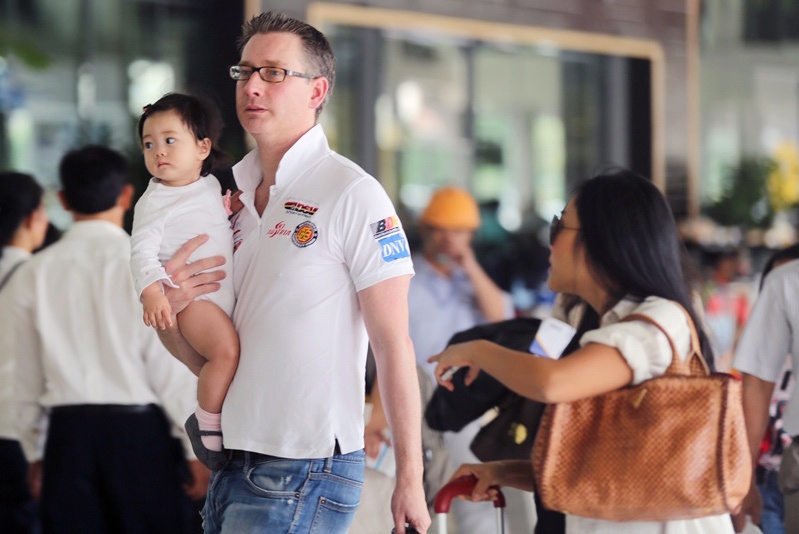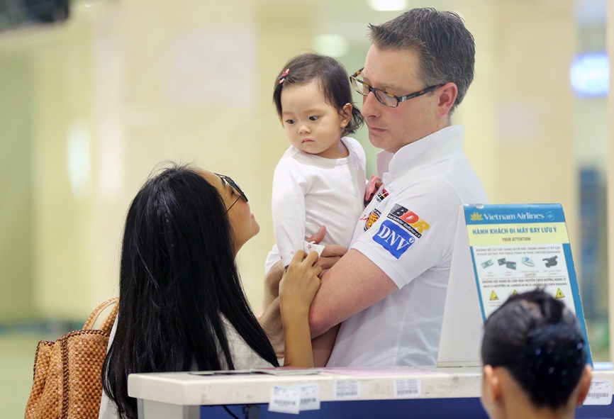 | Ông xã Đoan Trang vừa ẵm con, vừa kéo hành lý giúp vợ. Bé Sol chưa đầy 9 tháng tuổi nhưng đã được ba mẹ thường xuyên cho đi chơi ở nhiều nơi bằng máy bay. Cô bé rất ngoan, ngồi yên trong vòng tay của ba. |