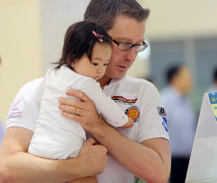 | Đoan Trang và Johan khá cưng chiều bé Sol. Cả hai liên tục hôn lên má của bé Sol. |