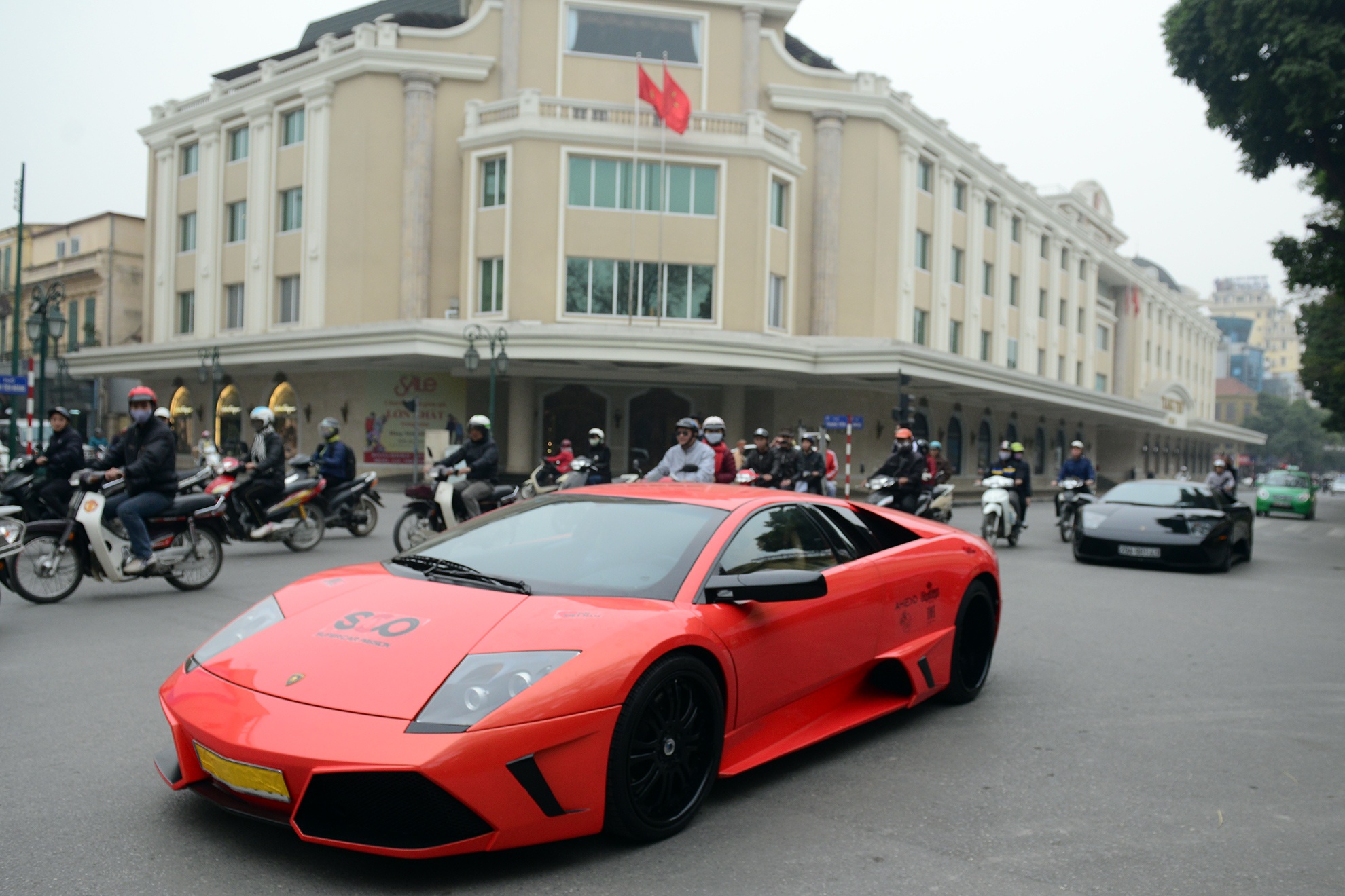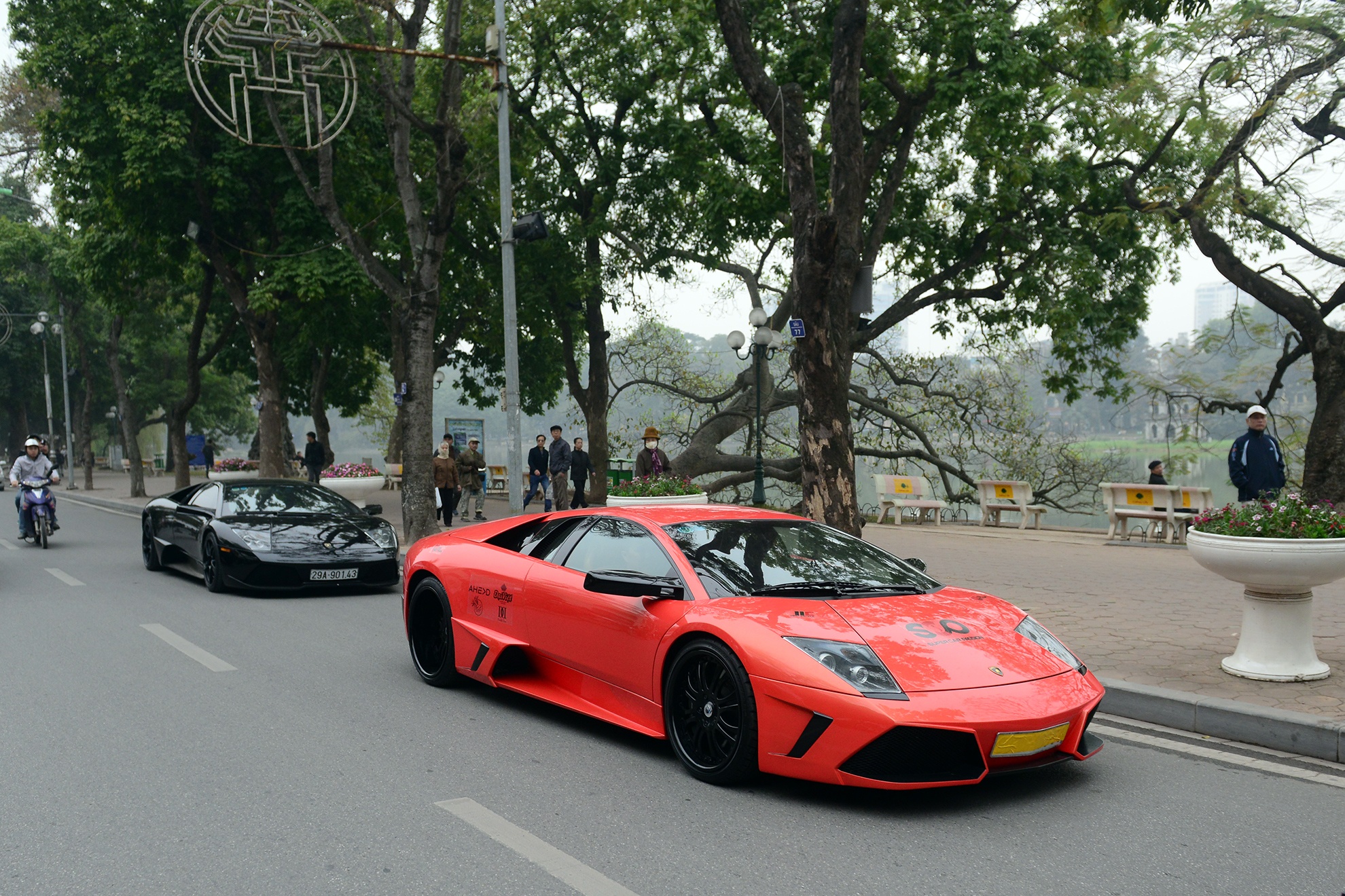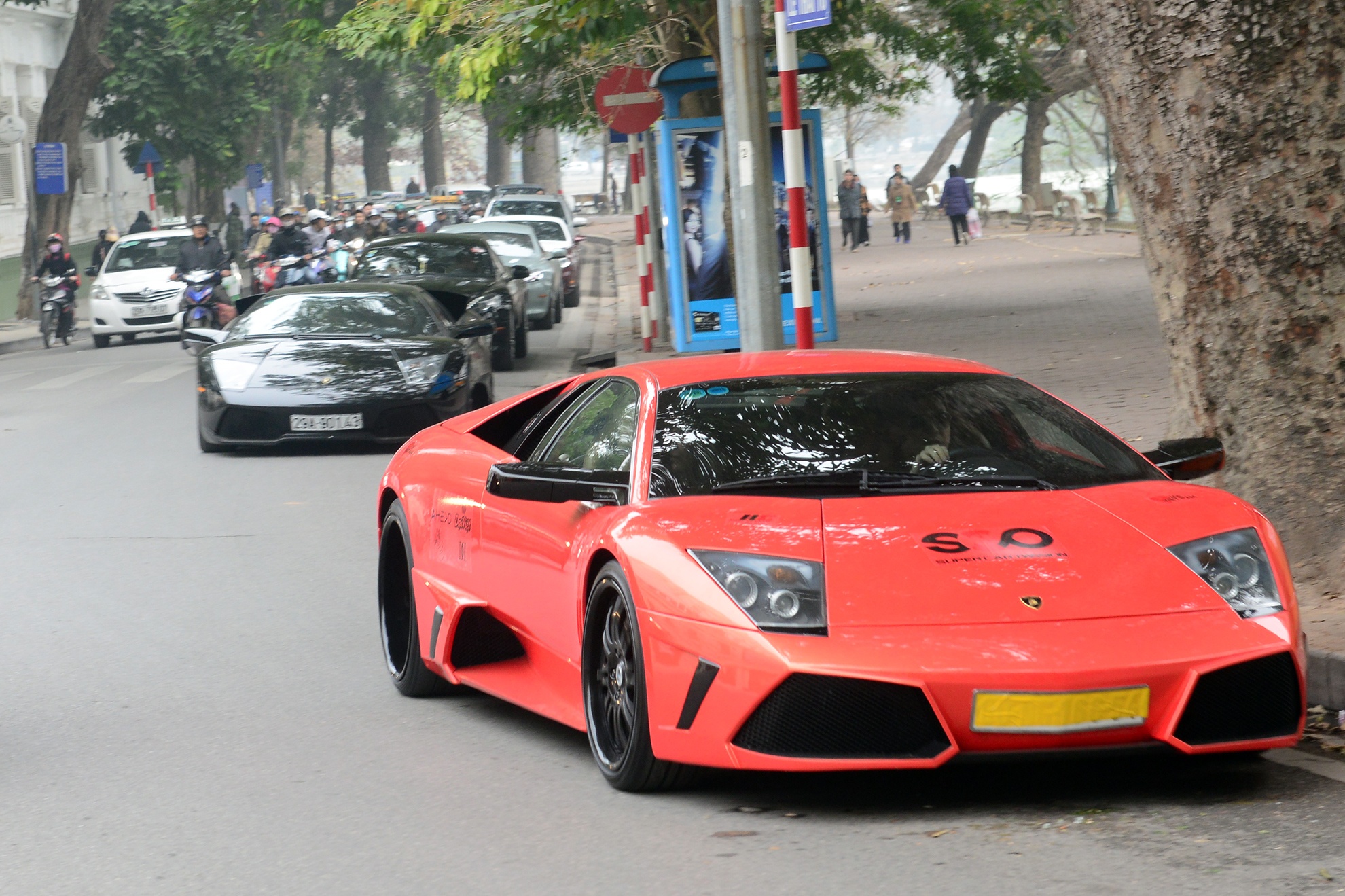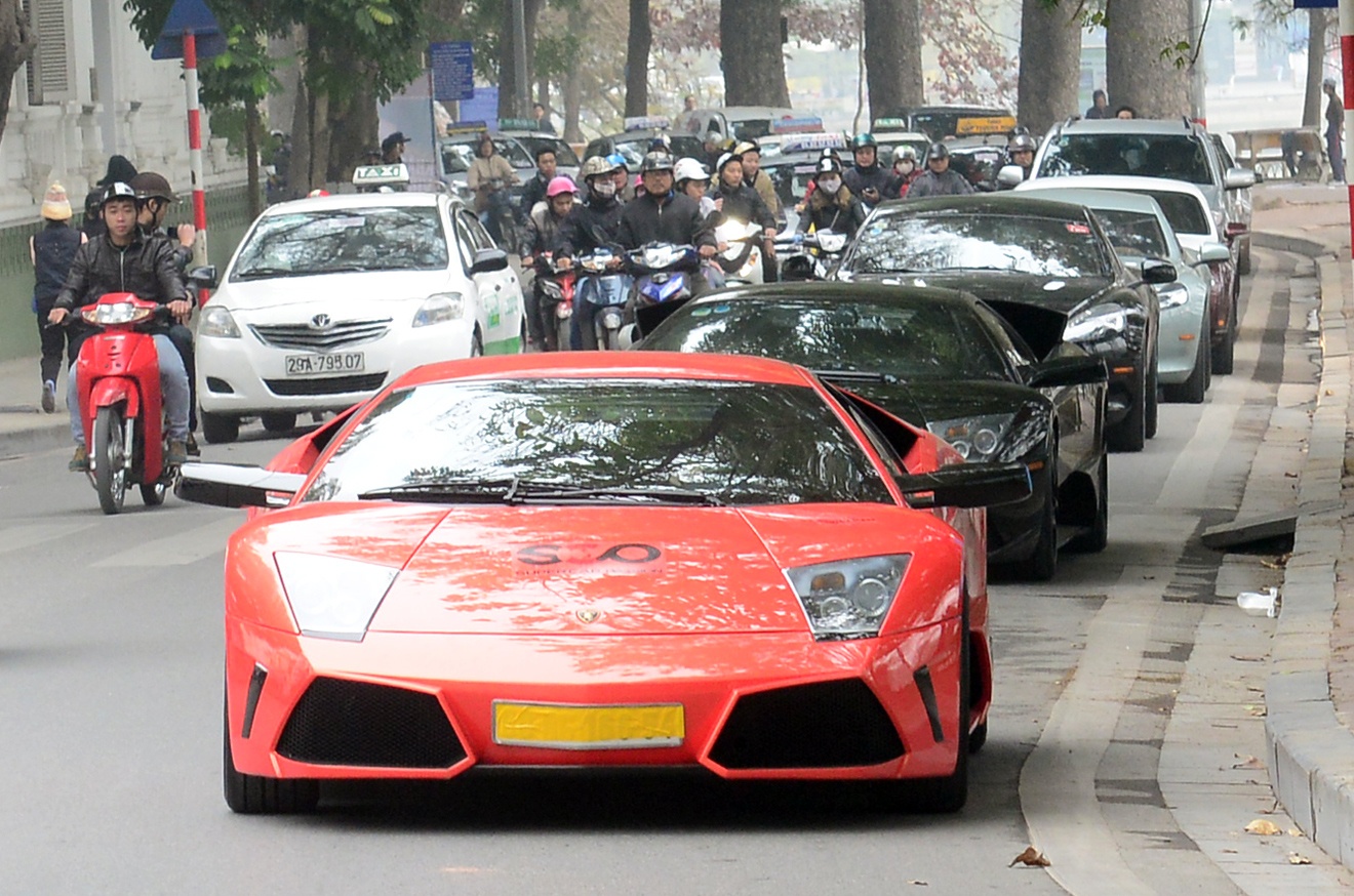 | Nổi bật trong đoàn xe là bộ đôi siêu xe Lamborghini Murcielago LP640 màu cam và màu đen. Siêu xe của Lamborghini trang bị động cơ V12 6,5 lit, công suất cực đại 640 mã lực tại 8.000 vòng/phút và mô-men xoắn cực đại 660 Nm tại 6.000 vòng/phút. Murcielago LP640 chỉ mất 3,4 giây để tăng tốc từ 0 lên 100 km/h trước khi đạt vận tốc tối đa trên 340 km/h. |