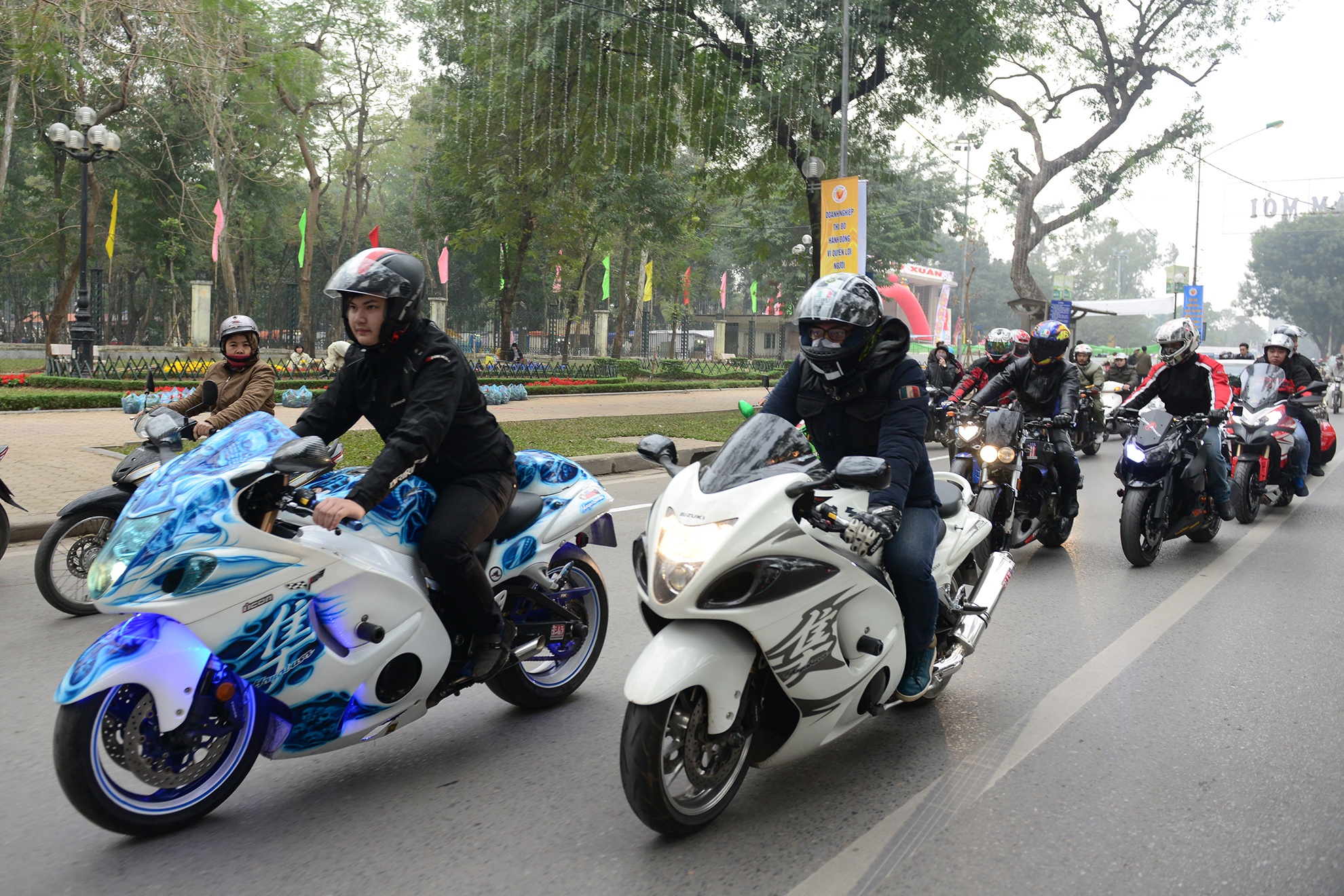 | Hai siêu mô tô Suzuki Hayabusa trong đoàn xe. Siêu mô tô được mệnh danh là "thần gió" hay "chim ưng" này sở hữu khối động cơ 1.340 phân khối, công suất lên tới 197 mã lực. Tại Việt Nam, Hayabusa được bán chính hãng với giá hơn 600 triệu đồng. |