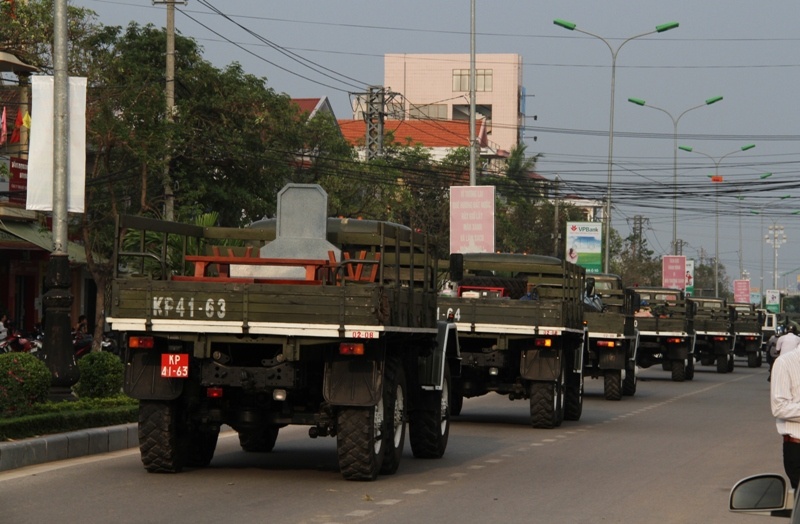 | Đoàn xe phục vụ Quốc tang Đại tướng Võ Nguyên Giáp di chuyển trên đường Trần Hưng Đạo rồi qua đường Lý Thường Kiệt, TP Đồng Hới về nơi nơi tập kết. |