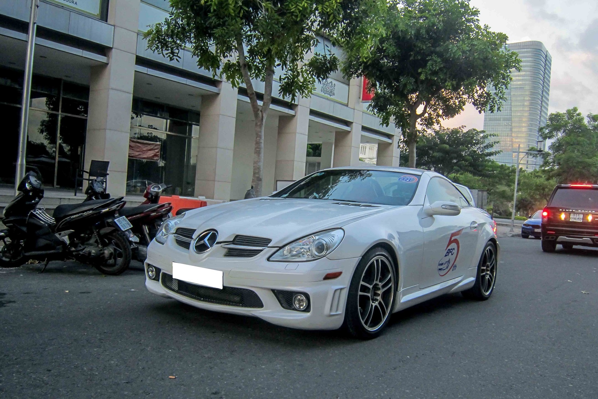 | Ngoài ra còn có một chiếc Mercedes SLK màu trắng được độ mâm. |