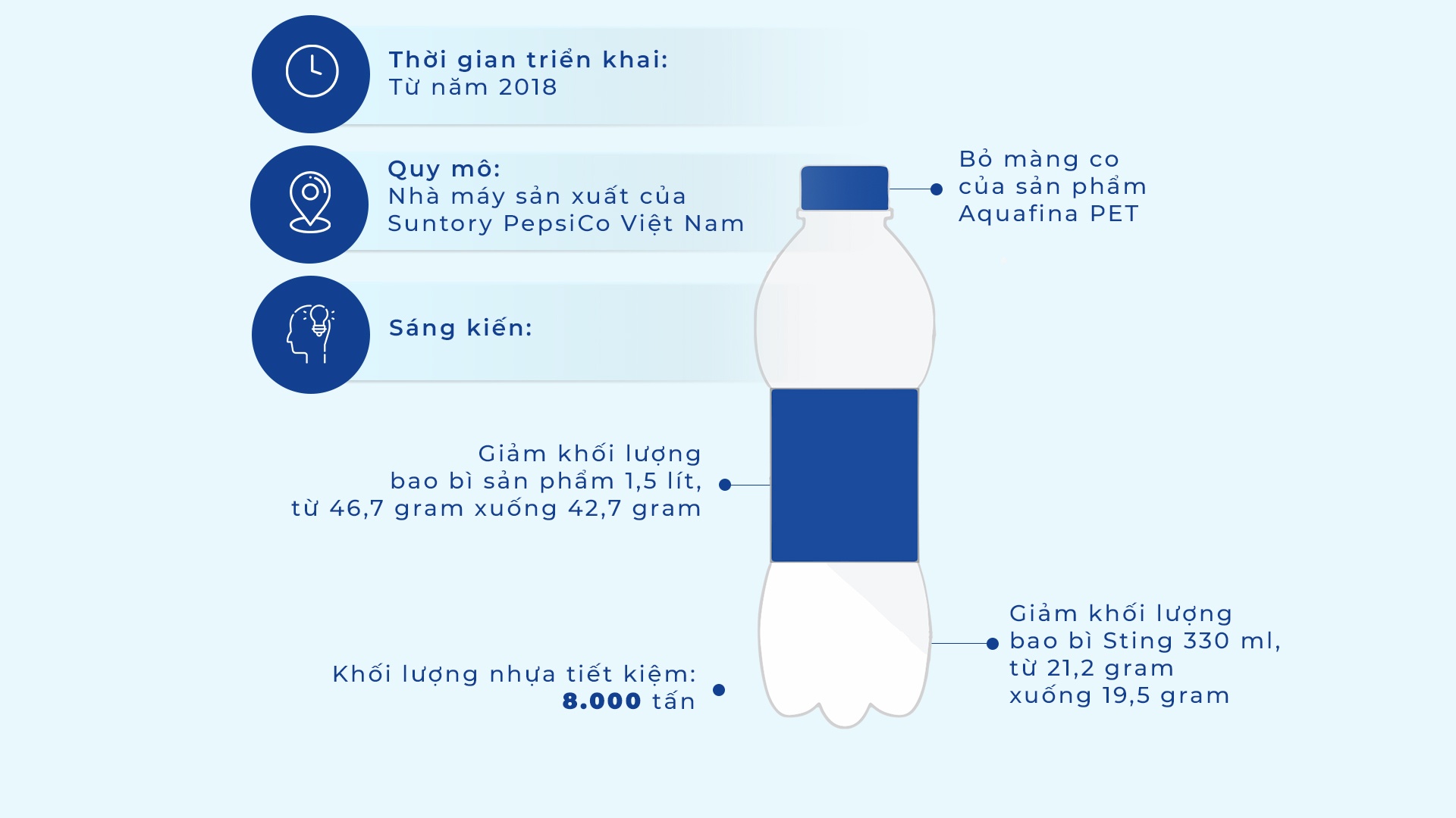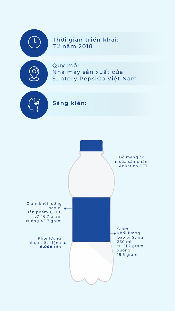 Từ năm 2018 đến nay, doanh nghiệp có nhiều sáng kiến nhằm cải tiến trong sản xuất như giảm trọng lượng và thay đổi chất liệu bao bì, loại bỏ màng co nắp chai… Qua đó, công ty tiết kiệm gần 8.000 tấn nhựa trong sản xuất.