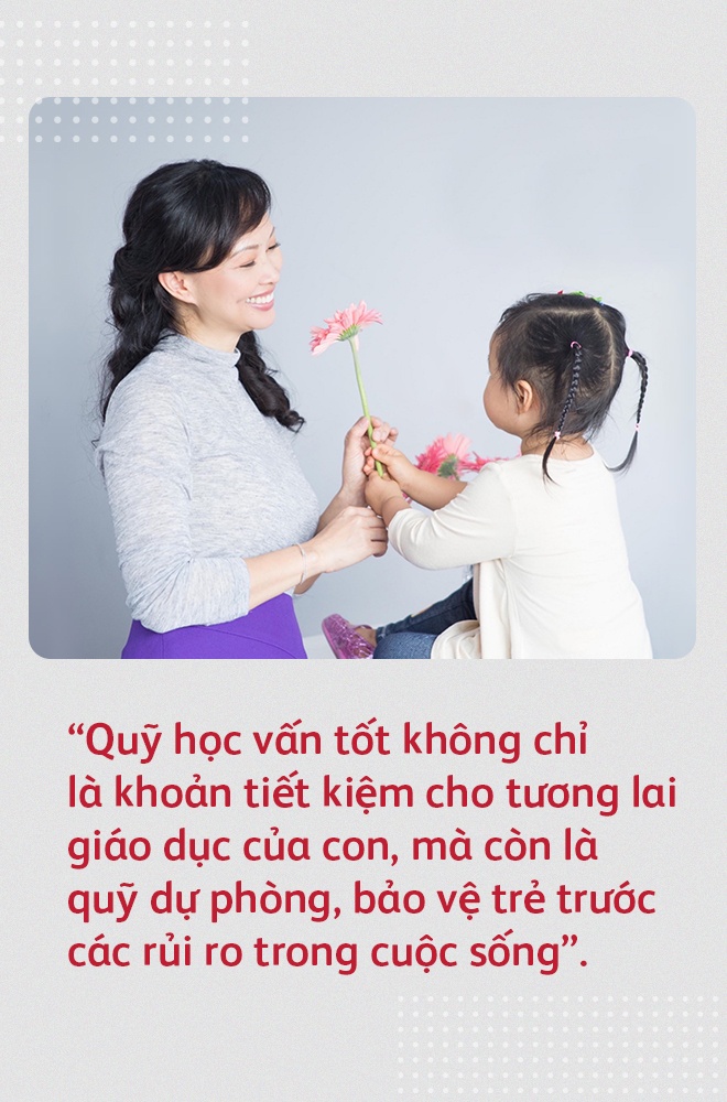 - Theo tôi, một quỹ học vấn tốt không chỉ là khoản tiết kiệm cho con đường học vấn của con sau này mà còn là quỹ dự phòng bảo vệ con trước các rủi ro trong cuộc sống. Nếu không may có sự cố xảy ra với bố mẹ thì con vẫn được bảo vệ và đảm bảo có chi phí để học tập khi lớn lên.