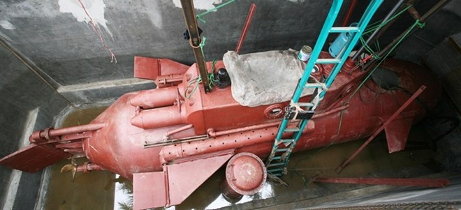 Thân tàu dài gần 9m, đã vận hành thử nghiệm “ngon lành” trong bể chứa nước ở giữa sân xí nghiệp của mình. Cũng lặn, cũng nổi, cũng lắc, cũng giật với chân vịt quay rào rào, ra-đa màn hình xanh đỏ nhấp nháy như ai.