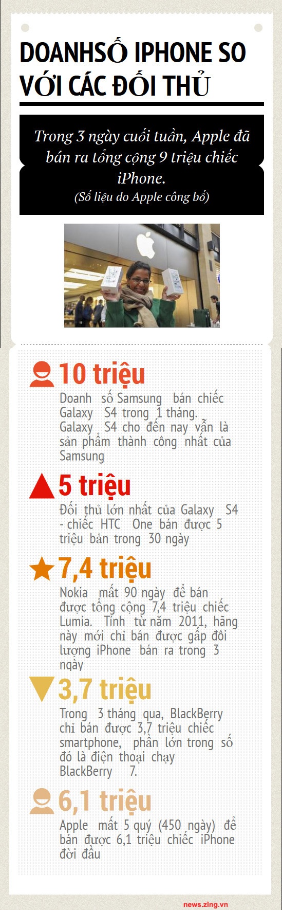 Số lượng iPhone bán ra sau 3 ngày là 9 triệu chiếc, gần tương đương với doanh số của Galaxy S4 trong một tháng.