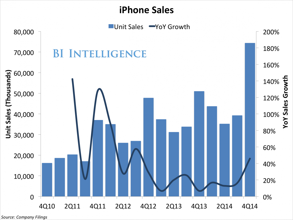 | Thực chất số điện thoại mà Apple bán ra trong một quý (74,5 triệu đơn vị) nhiều hơn lượng iPhone mà hãng bán được trong cả năm tài chính 2011. |