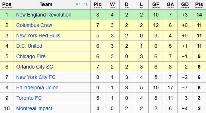 New England Revolution dẫn đầu bảng xếp hạng miền Đông với 14 điểm sau 8 trận. Họ hơn 3 điểm so với đội bám đuổi Columbus Crew, nhưng đối thủ còn một trận chưa thi đấu.