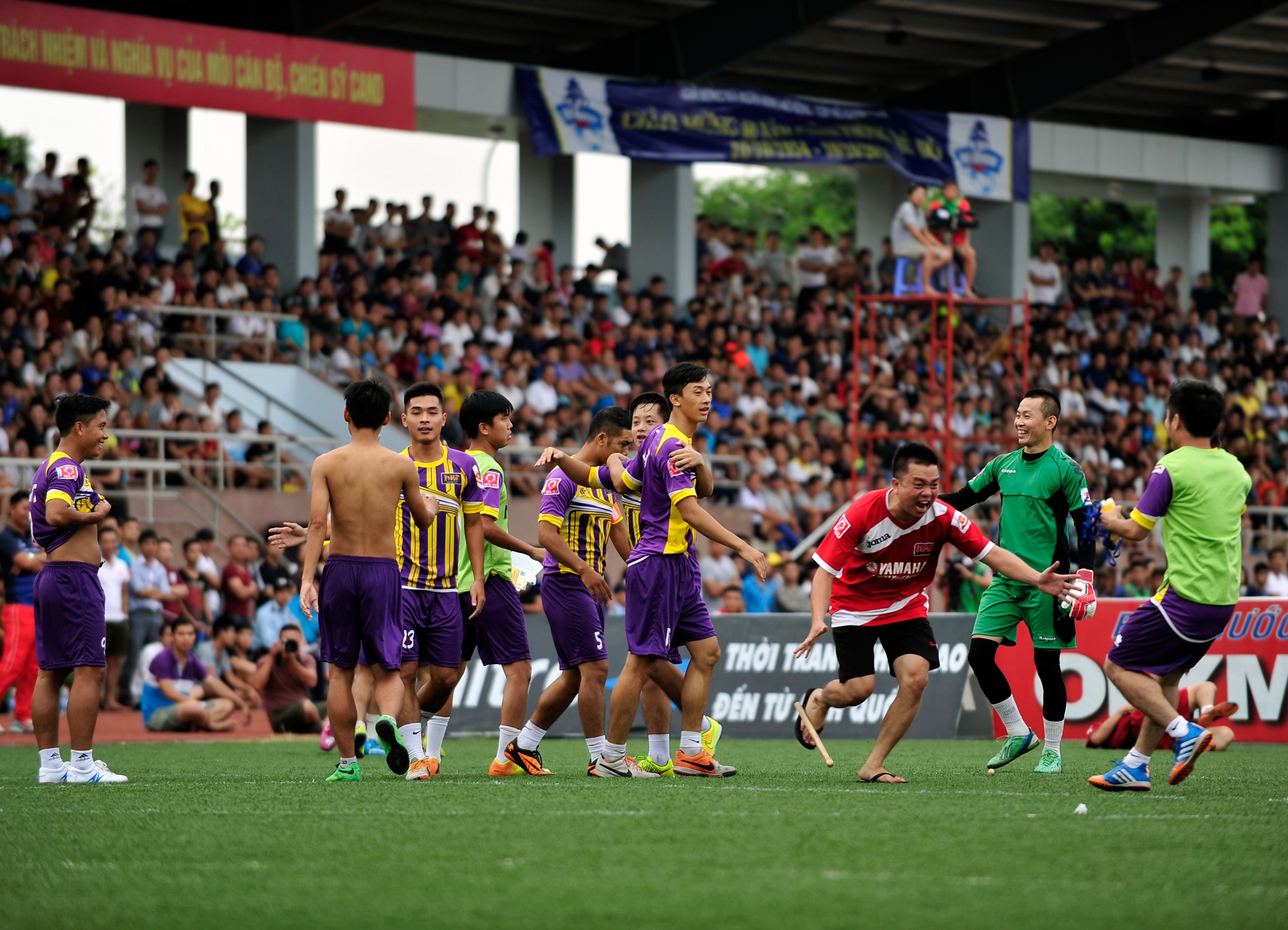 | Đã có lúc thủ môn và huấn luyện viên tạm quyền của đội bóng HAT phải lao ra giữa sân để can ngăn những cái đầu nóng va chạm trong trận đấu. |