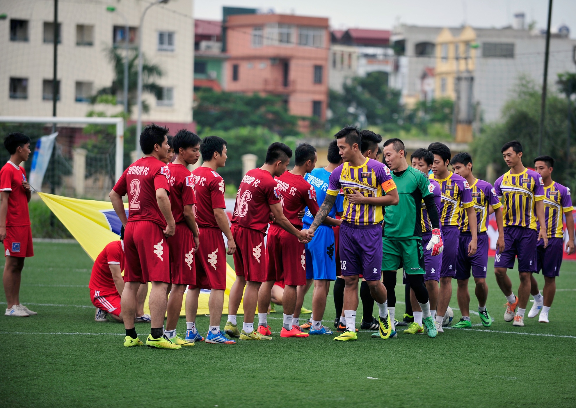 Hai đội bóng HAT và Top Group thực hiện nghi thức bắt tay nhau trước khi bóng lăn lúc 15h ngày 5/10, ở trận đấu thuộc vòng 9 giải Ngoại hạng phủi Hà Nội lần 2 diễn ra trên sân Bộ Công an (Nguyễn Xiển, Hà Nội).