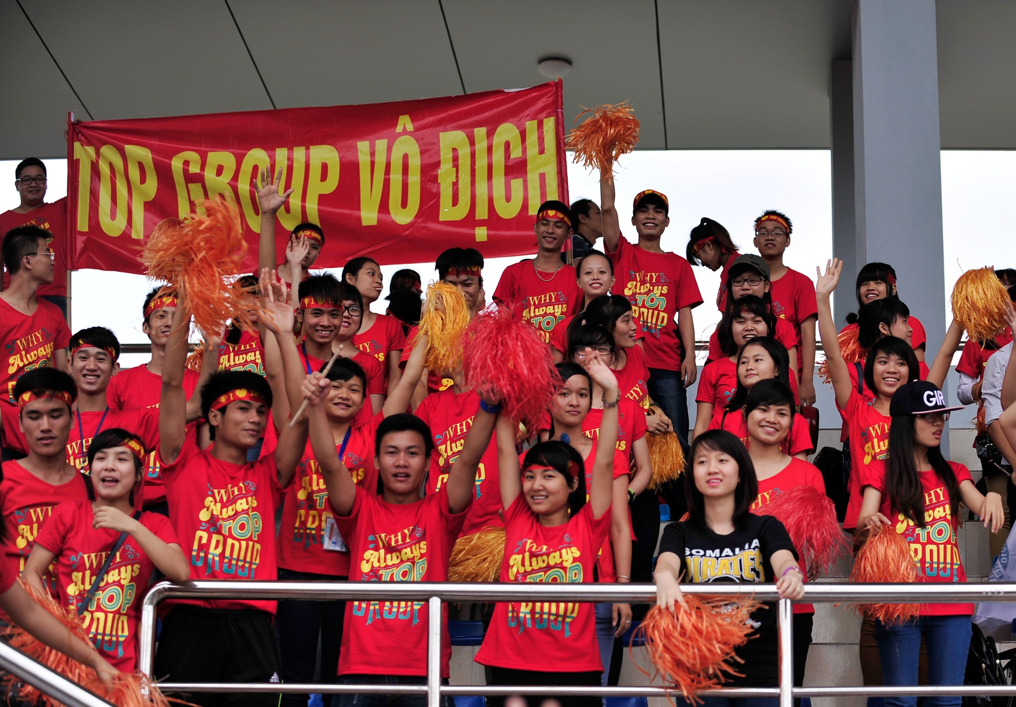 Trên khán đài, nhiều cổ động viên xinh đẹp của Top Group FC mặc áo đỏ theo màu áo của đội bóng và cổ vũ nhiệt tình.