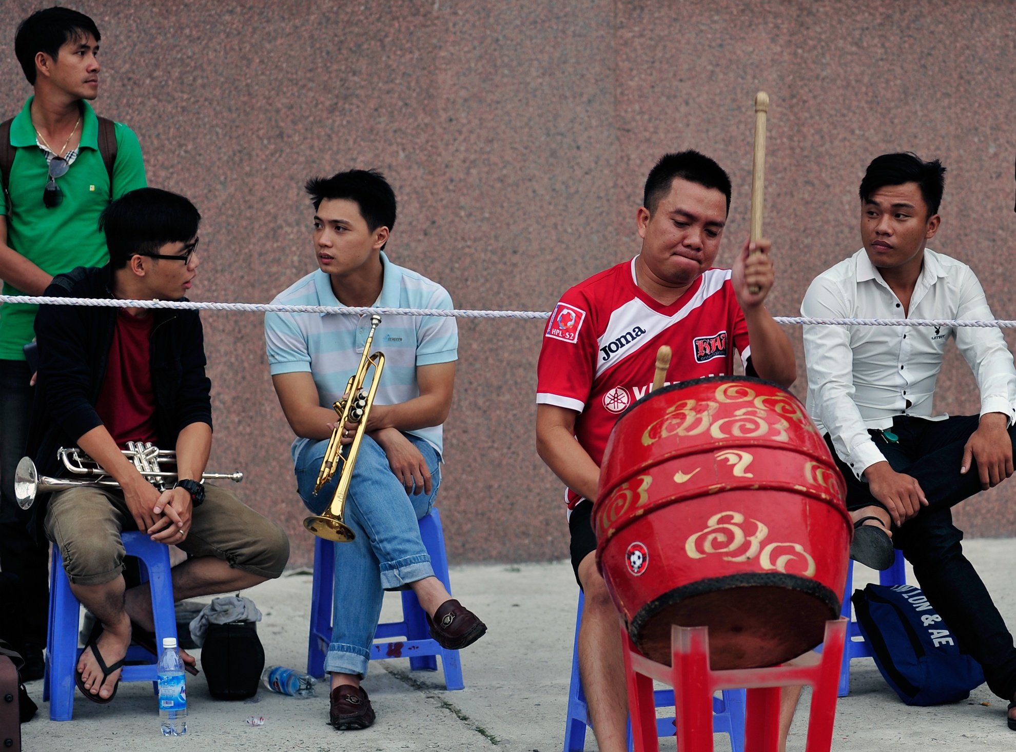| Tay trống và 2 tay kèn khuấy đảo trận đấu bằng những bài hát vui nhộn và nhịp trống dồn dập khi đội nhà tấn công. |