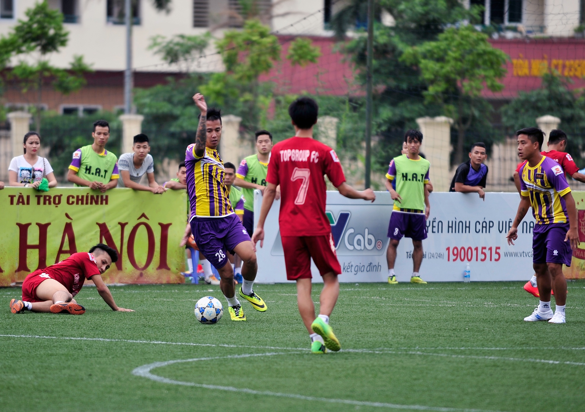 | Đội trưởng Lê Sĩ Mạnh khoác áo số 28 là cầu thủ chơi khá hay của đội HAT, anh di chuyển quanh sân và được các cầu thủ bên đội Top Group chăm sóc kĩ lưỡng. |