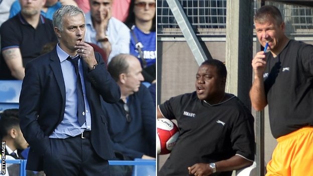 | Những gì HLV Garry Brown (quần vàng) đang trải qua cùng New Mills thất vọng hơn rất nhiều so với đồng nghiệp Jose Mourinho. |