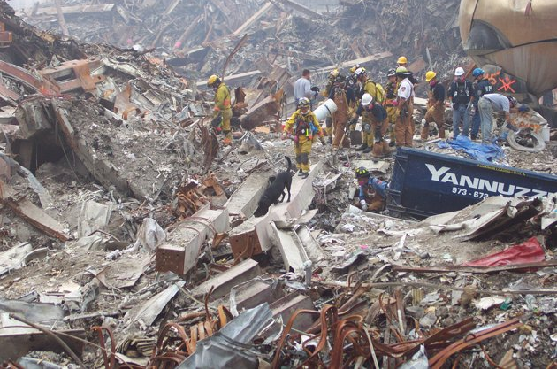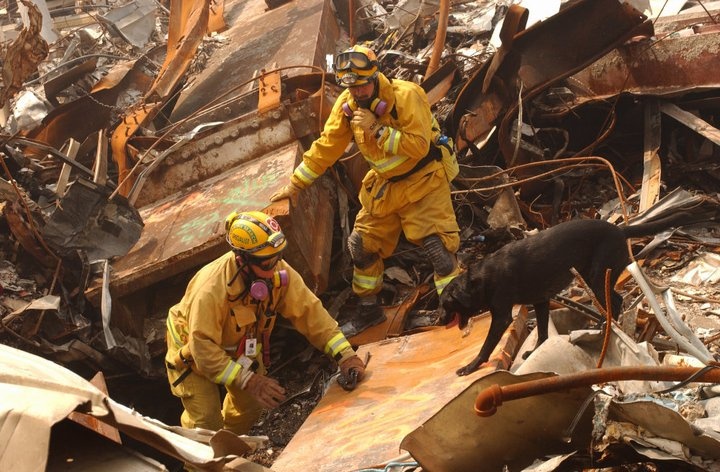 Chú chó Cowboy của FEMA tìm kiếm tại hiện trường tòa tháp đôi đổ sụp ngày 21/9/2001. Sau nhiều ngày, lực lượng cứu hộ dần hết hy vọng tìm thấy người còn sống, họ chuyển sang tìm thi thể các nạn nhân. Các vật dụng cá nhân và đồ trang sức cũng được thu hồi để trả lại gia đình người đã khuất. Ảnh: FEMA News