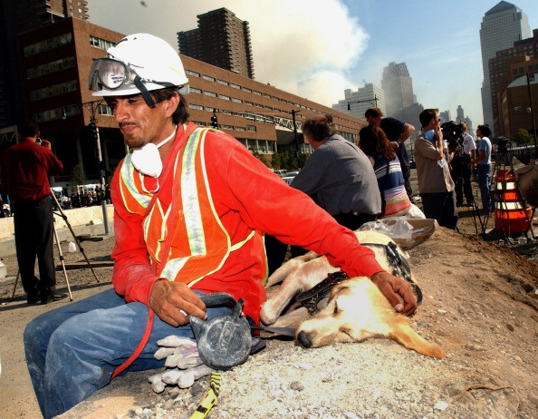 Mike Scott và chú chó Billy đang làm nhiệm vụ trên đống đổ nát ở tòa tháp đôi ở trung tâm New York (WTC). 11/9/2001 trở thành ngày đen tối nhất trong lịch sử nước Mỹ khi những kẻ khủng bố lái máy bay đâm vào WTC khiến hơn 3.000 người thiệt mạng. Ngay sau vụ tấn công, lực lượng an ninh huy động đội cứu hộ kèm hàng trăm cảnh khuyển tìm kiếm các nạn nhân. Khoảng 950 con chó tham gia cứu hộ tại hiện trường vụ khủng bố. Ảnh: FEMA News