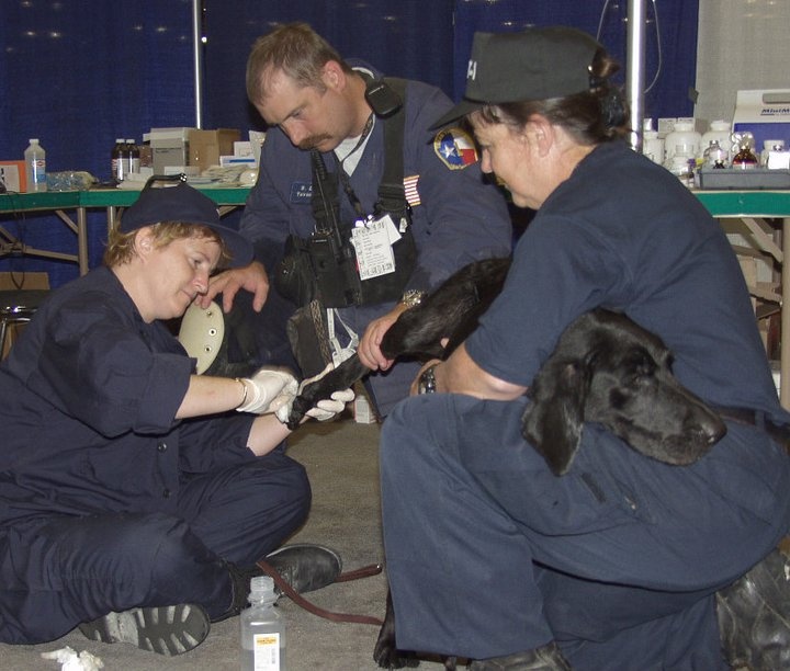Hai nhân viên y tế Marie Suthers và McCable chữa trị cho một con chó bị thương trong khi làm nhiệm vụ ở hiện trường vụ 11/9. Ảnh: FEMA News