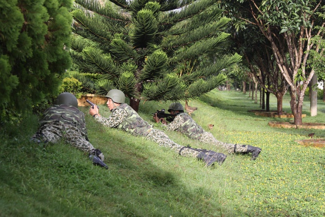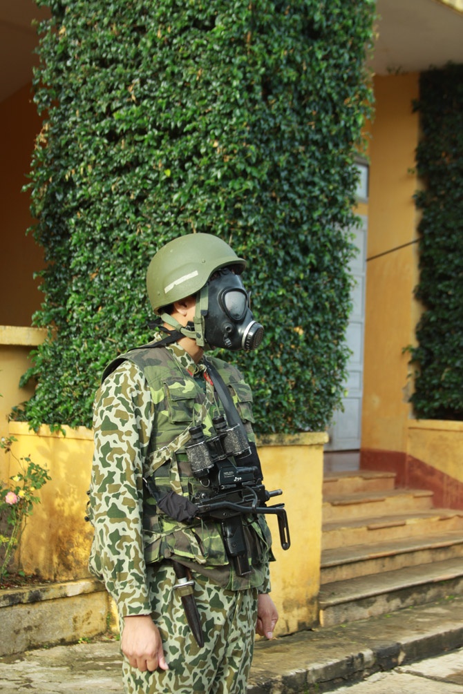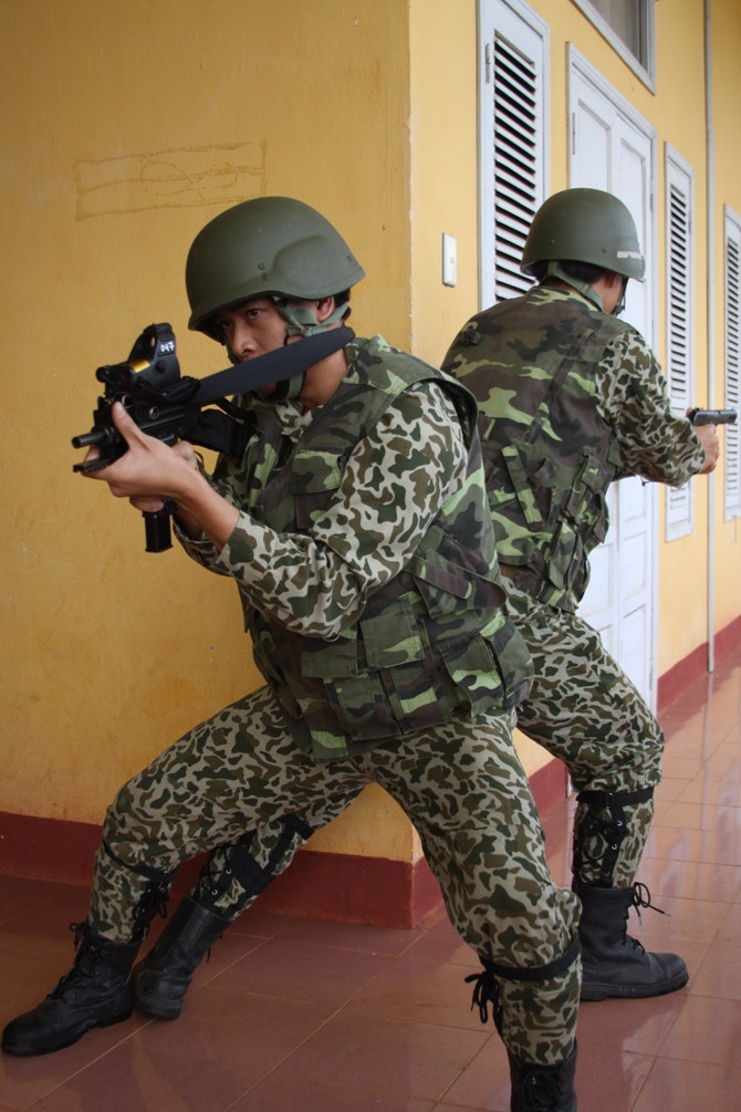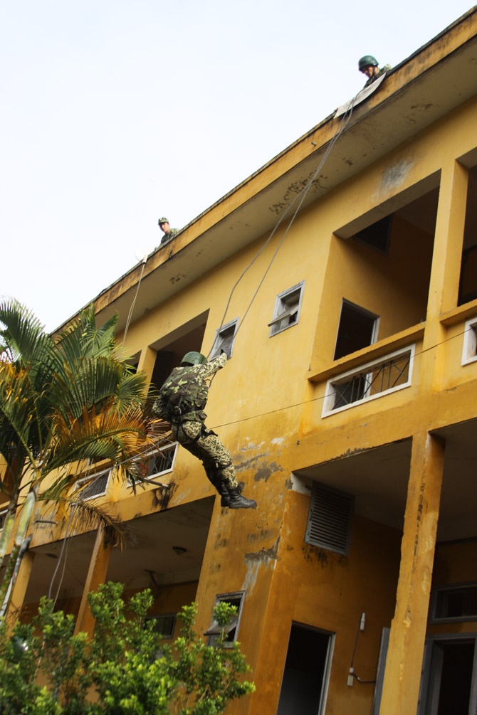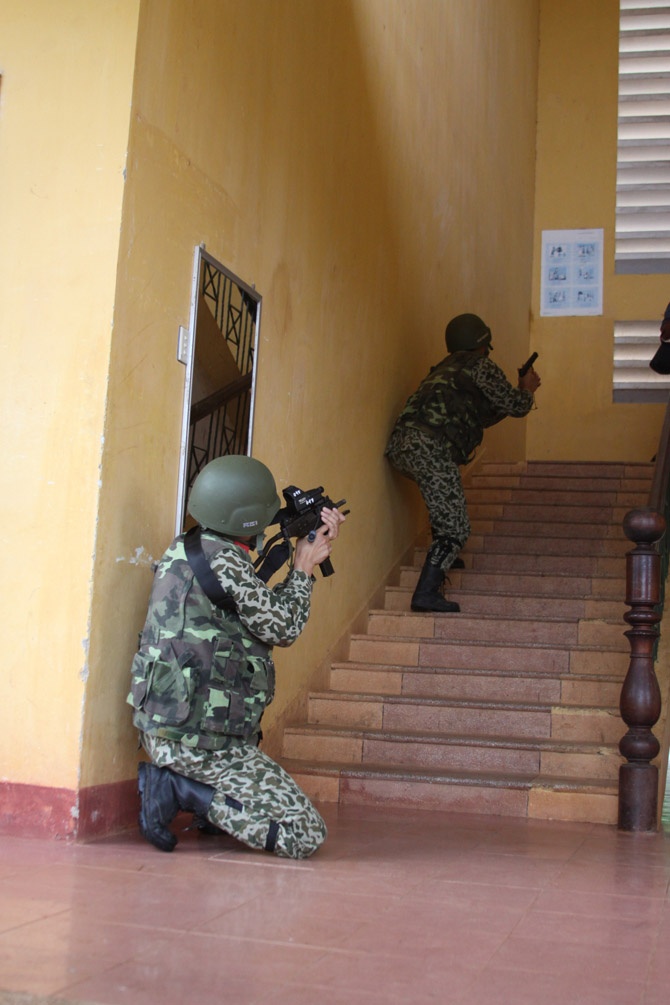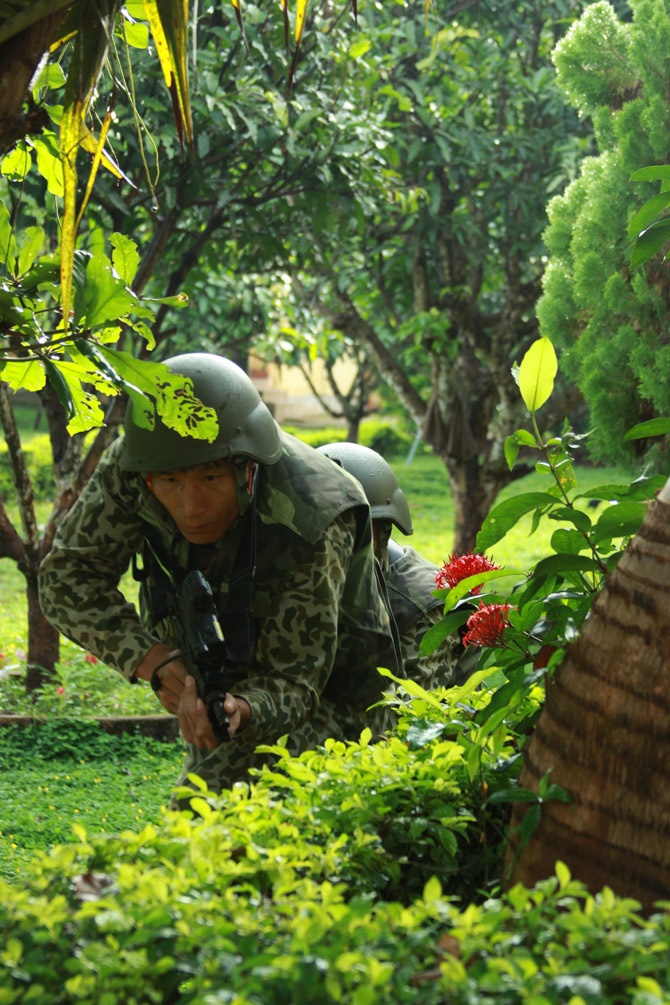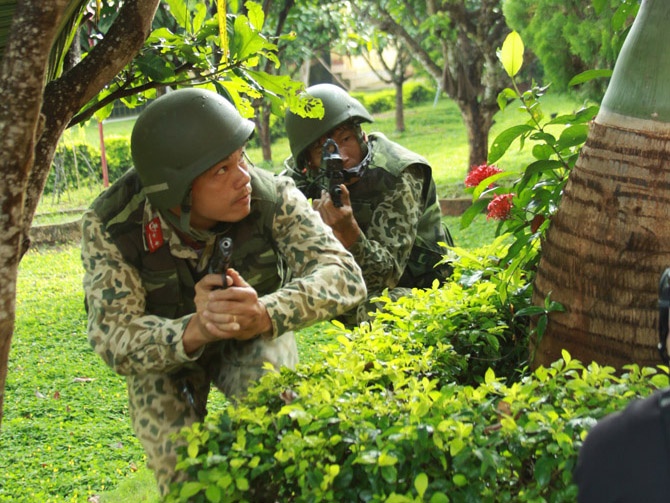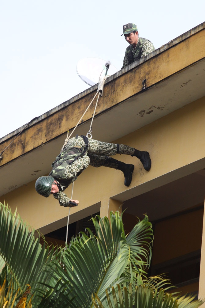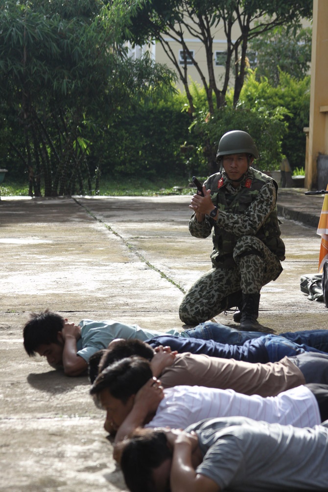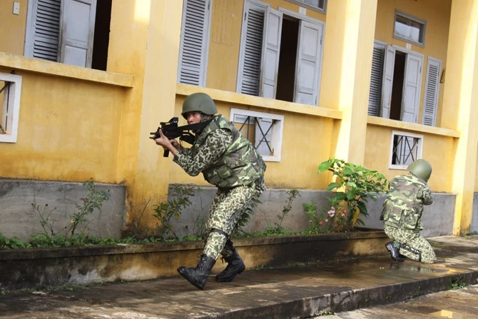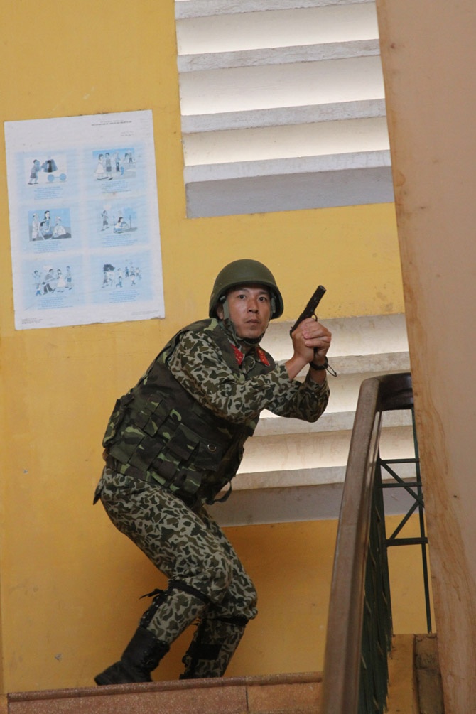| Theo tình huống giả định, ngày 13/9, một số tên khủng bố đã đột nhập tòa nhà 2 tầng bắt cóc người dân làm con tin. |