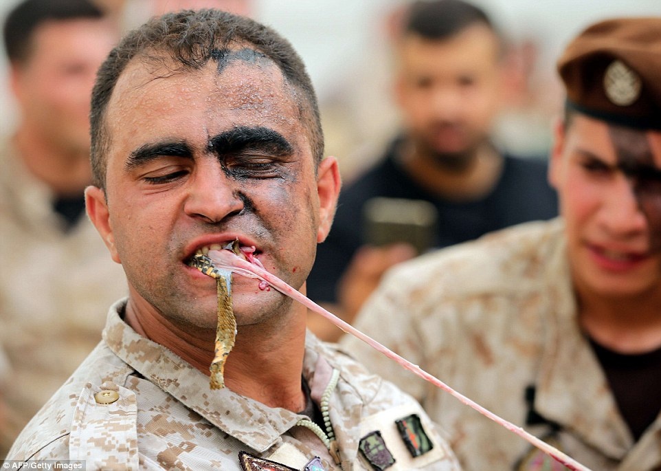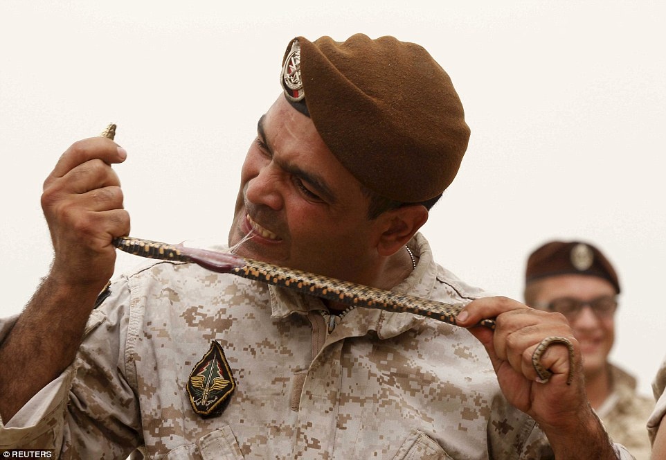 | Quân đội nước này tổ chức nghi lễ ăn rắn sống hàng năm. Đây là một truyền thống nhằm chứng tỏ sức mạnh của đàn ông Arab. Ảnh: Reuters |