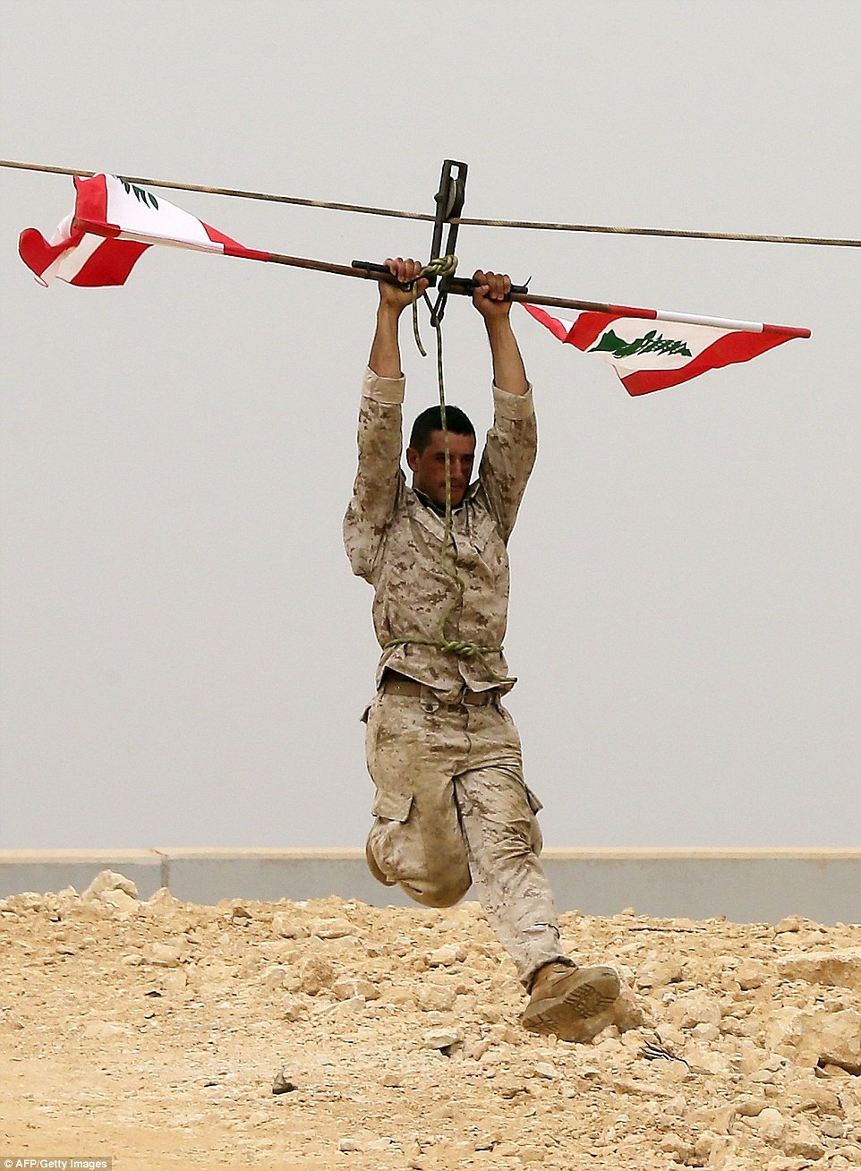 | Một binh sĩ thực hiện bài tập đu dây vượt chướng ngại vật, một trong những nội dung tập huấn nâng cao thể lực. Ảnh: AFP |