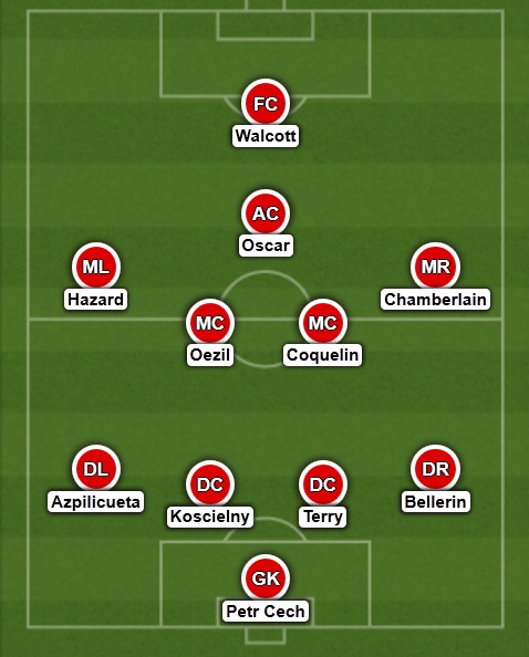 Đội hình kết hợp giữa Chelsea và Arsenal. Các cầu thủ dự bị gồm Begovic, Cahill, Mertesacker, Matic, Cazorla, Alexis Sanchez, Diego Costa.