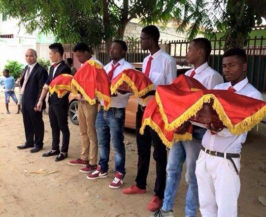 | Các chàng trai Châu Phi bảnh bao bê tráp trong đám cưới chàng trai Việt. |