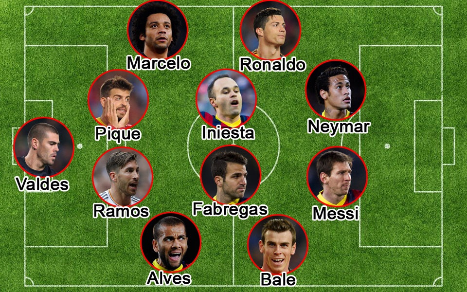 | Đội hình đắt giá hợp nhất giữa Real - Barca có tổng số tiền lên đến 596 triệu euro. |