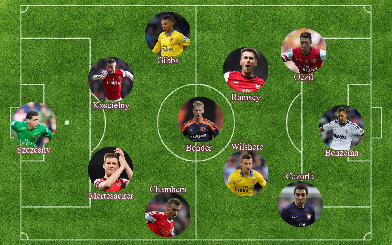 | Đội hình của Arsenal không có Lukasz Fabianski, Mikel Arteta, Lukas Podolski, Olivier Giroud, Theo Walcott. |