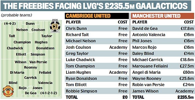 | Theo dự đoán của Daily Mail, HLV Louis Van Gaal sẽ tung ra đội hình trị giá 235,5 triệu bảng để đấu đội hình trị giá 0 bảng của đội chủ nhà. |