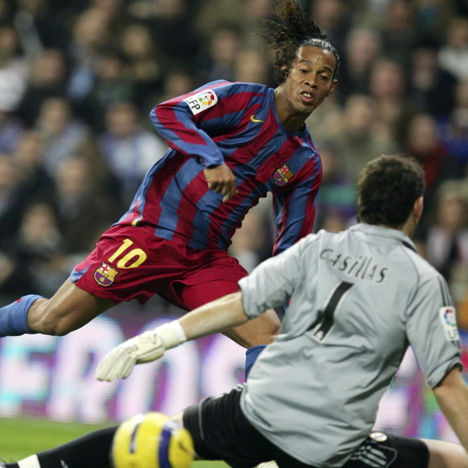 Tiền vệ tấn công Ronaldinho (Barcelona): Danh thủ người Brazil sở hữu đôi chân ma thuật, có thể đặt hàng phòng ngự Real vào tình trạng báo động bất kỳ thời điểm nào. Trong trận siêu kinh điển diễn ra tại Bernabeu ngày 19/11/2005, fan Real thậm chí đứng bật dậy và vỗ tay tán thưởng Ronaldinho sau khi “chàng vẩu” ghi bàn đẹp mắt vào lưới Casillas. Ronaldinho từng ghi bàn ở 4 trận liên tiếp gặp Real. Ảnh: Bleacherreport.
