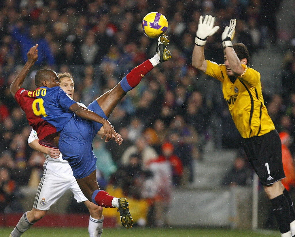 Tiền đạo Samuel Eto’o (Barcelona): Eto’o nằm trong số ít cầu thủ từng khoác áo cả Real Madrid lẫn Barcelona. Tuy nhiên, tên tuổi của trung phong người Cameroon chỉ được nhắc đến trong những năm tháng anh thi đấu tại Nou Camp. Eto’o từng ghi những bàn thắng quan trọng vào lưới Real, giúp Barca đăng quang ngôi vô địch La Liga. Ảnh: Getty Images.
