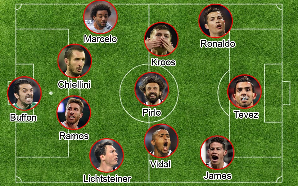 Gareth Bale, Karim Benzema đánh mất vị trí vào tay James Rodriguez và Carlos Tevez trong đội hình kết hợp giữa Real và Juve do Goal bình chọn.