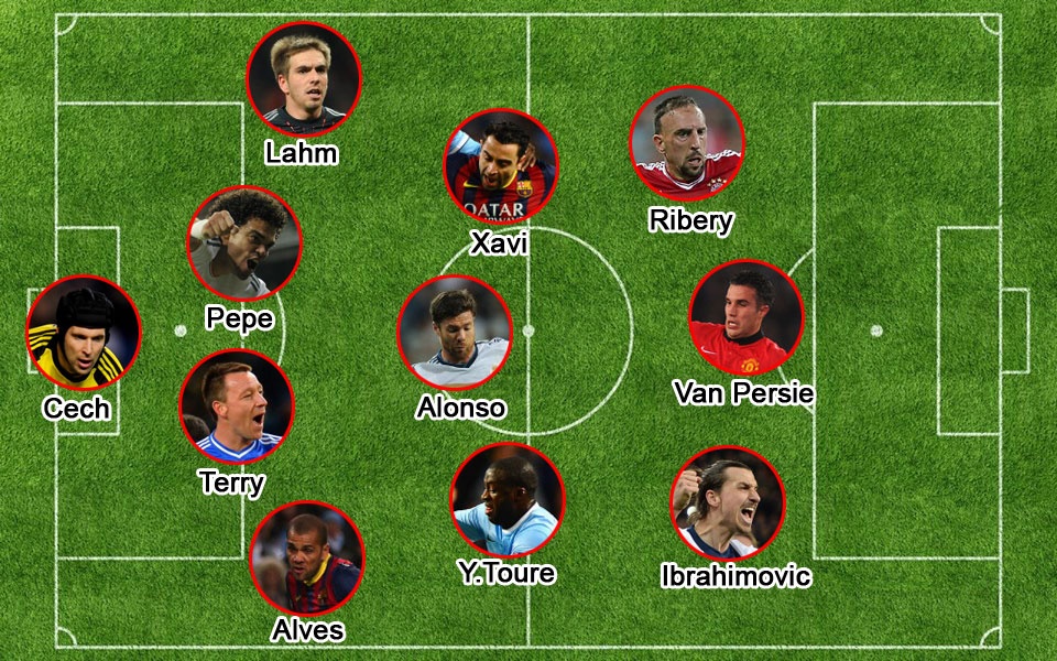 | Đội hình lão tướng xuất sắc nhất Champions League mùa này tính theo sơ đồ 4-3-3. |
