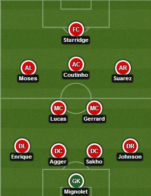 | Sturridge đá trung phong, Moses và Suarez đảm nhận hai cánh, Coutinho đá hộ công. |