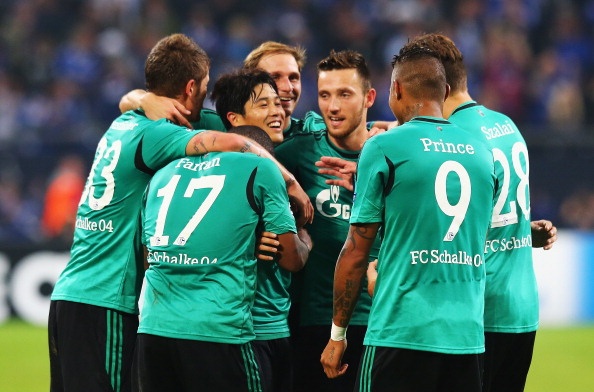 | Uchida trong vòng vây của các cầu thủ Schalke. |